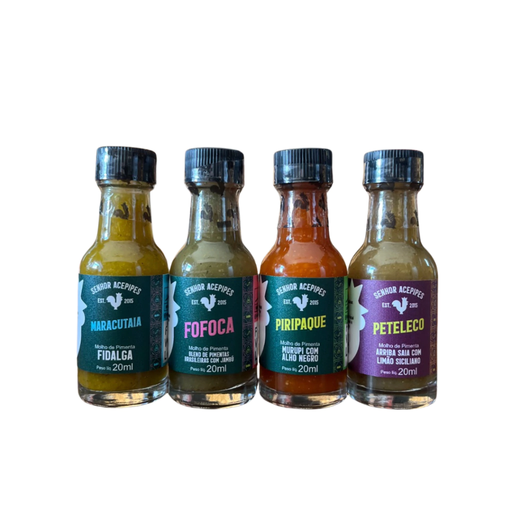 Seleção para prestigiar frutos e sabores do nosso país - 4 pimentas de 20 ml na caixa cartonada. Surpreenda os apaixonados por pimenta com paladar sofisticado!